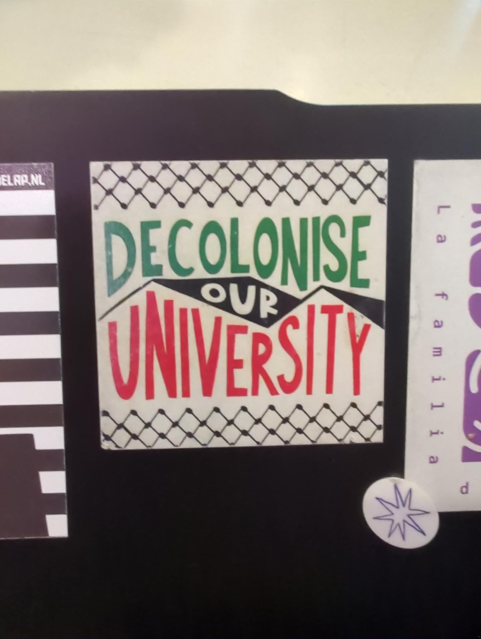 This is a sticker that I got from students who graduated last year. These were very impressive students. They played an important role in the city-wide protests against the silence and complicity of this society in the face of the ongoing genocide.